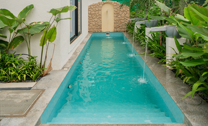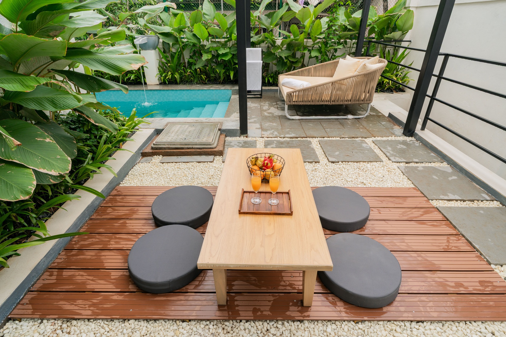 This 4BHK private villa features a sparkling swimming pool, open-to-sky bathrooms, and a lush green garden that sets the tone for a relaxing tropical escape.