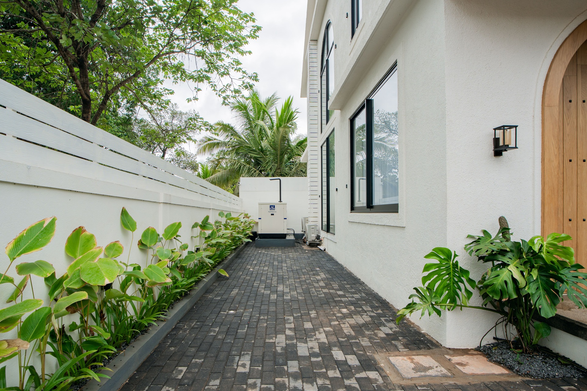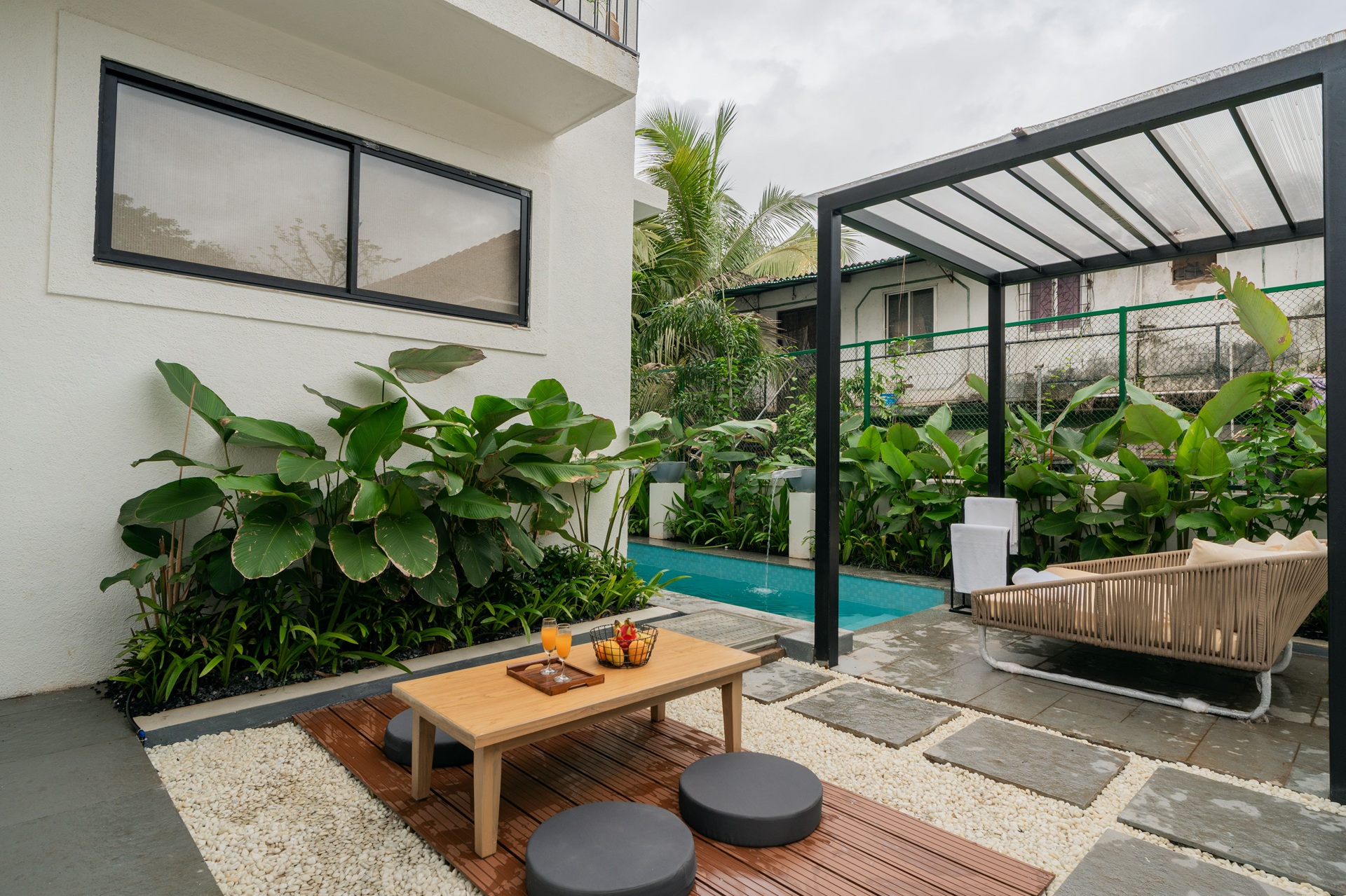 This 4BHK private villa features a sparkling swimming pool, open-to-sky bathrooms, and a lush green garden that sets the tone for a relaxing tropical escape.